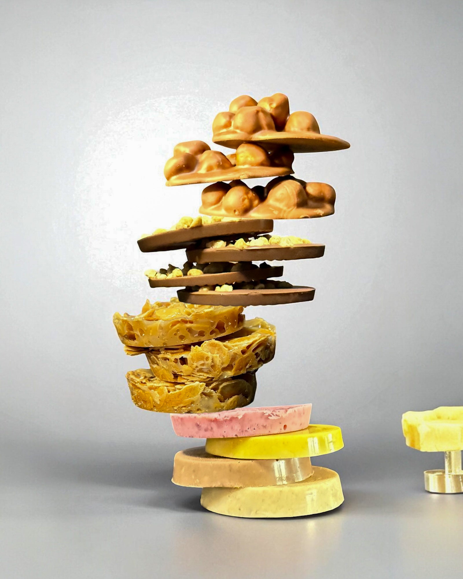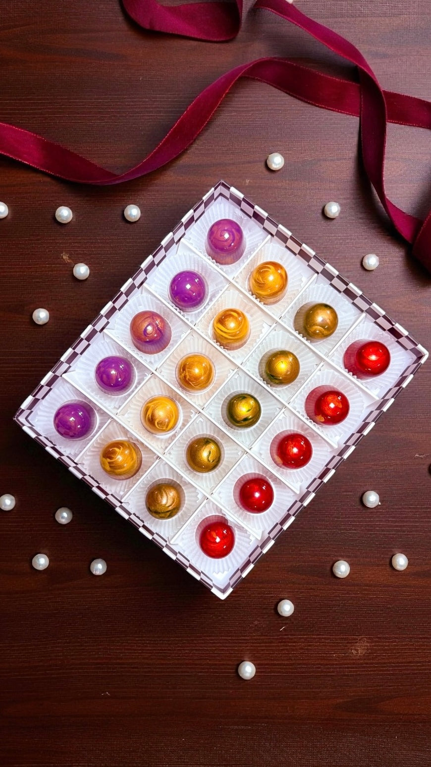 Κάθε σοκολατάκι είναι μια μικρή ιστορία μια χρωματιστή χειροτεχνία που κρύβει μέσα της στρώσεις από βελούδινη σοκολάτα, πραλίνες και υλικά που ισορροπούν ανάμεσα στη φινέτσα και την απόλαυση.